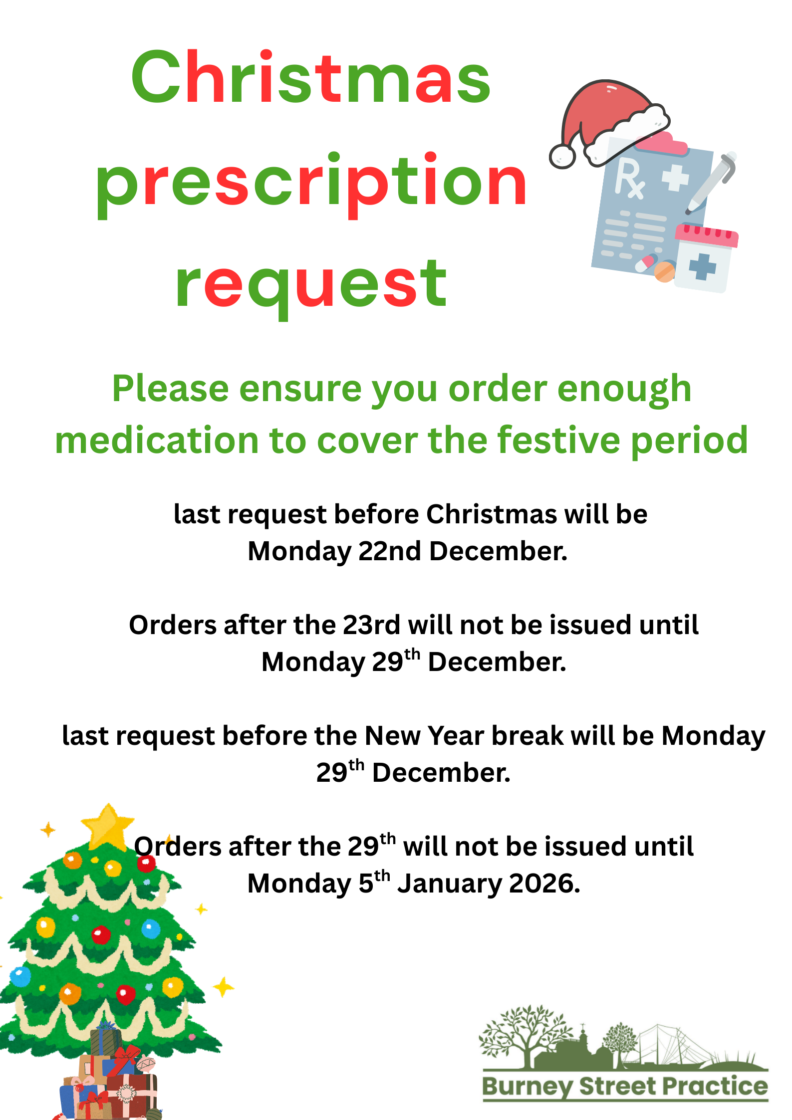 Order your prescription in time for Christmas. To avoid delays in getting your medicines over the festive period, remember to order your prescription in good time.
